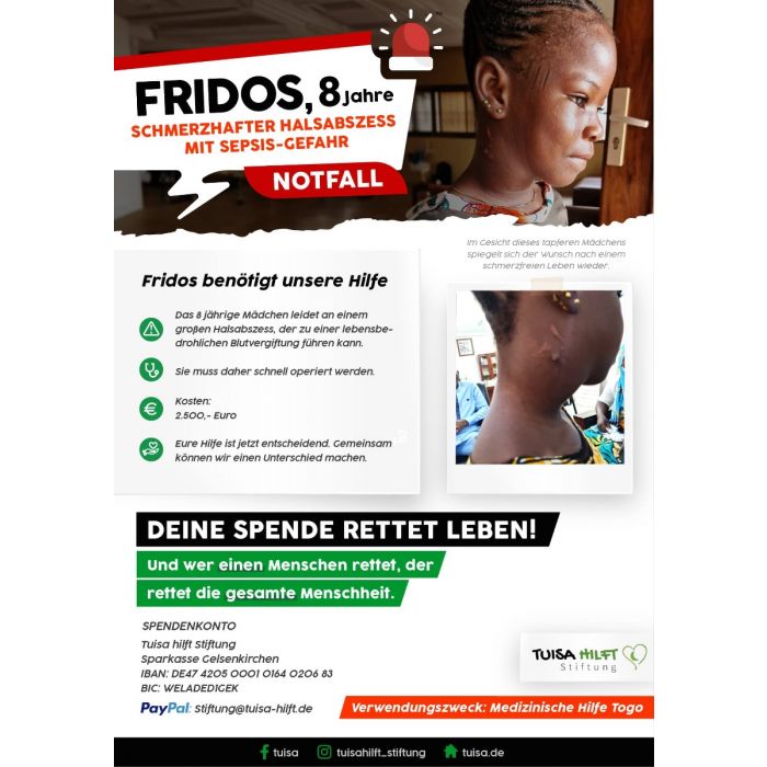 Wie stehen heute vor einer Herzensangelegenheit: Die kleine Fridos aus Togo, gerade mal 8 Jahre alt, kämpft gegen einen lebensbedrohlichen Halsabszess. Eine schnelle Operation ist ihre einzige Chance, doch die Kosten belaufen sich auf 2500 Euro.
