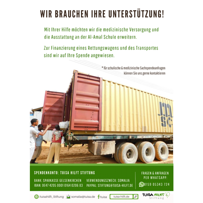 Des Weiteren möchten wir direkt die Gelegenheit des Container-Transports nutzen, um Schulmaterialien für unsere Al-Amal Schule nach Somalia zu schicken. Auch hier sind Sachspenden ebenfalls eine große Hilfe.