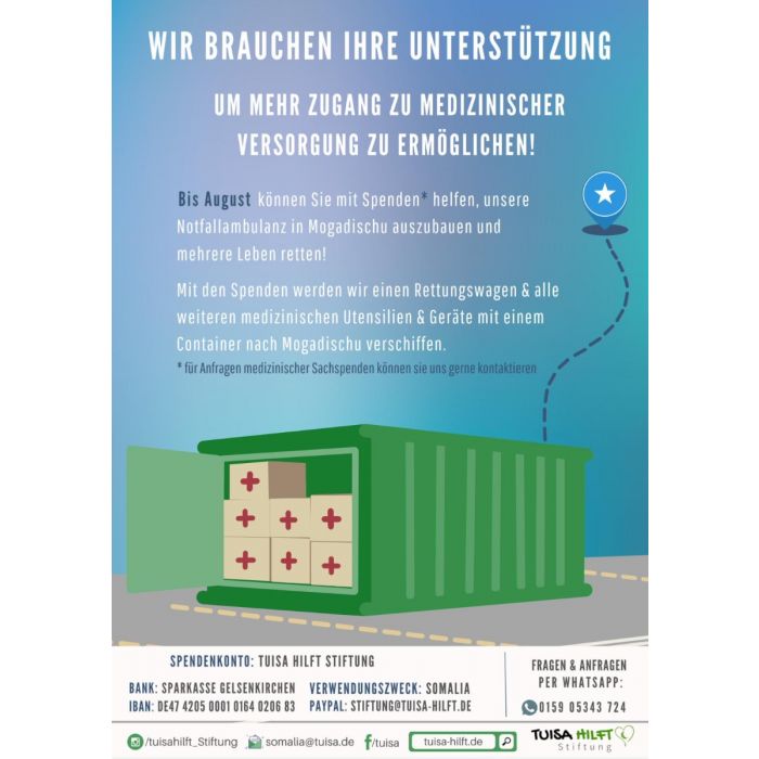Unser Hilfenetz in Somalia steht soweit und doch fehlen weitere Mittel. Um das Gesundheitssystem vor Ort auszubauen, möchten wir einen Container mit einem zweiten Rettungswagen und medizinischen Utensilien nach Mogadischu befördern. Zur Finanzierung des Transports und der Güter brauchen wir Ihre Unterstützung.
