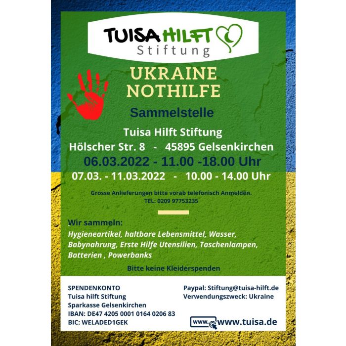 Damit auch deine Hilfsgüter/ Spenden bei den Opfern des Krieges ankommen, haben wir die Sammelstelle weiterhin geöffnet.